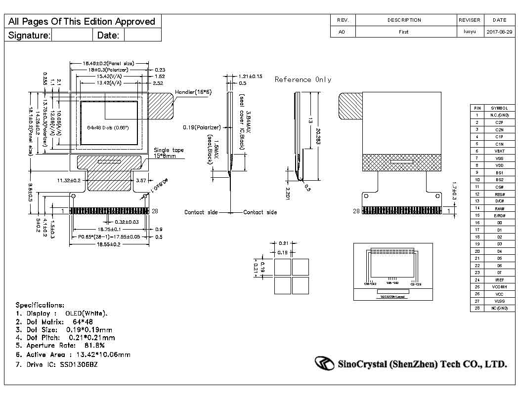 0.66 ” OLED,64×48分辨率,SSD1306BZ IC,28PIN